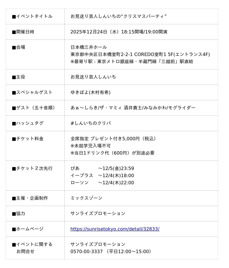 『お見送り芸人しんいちの“クリスマスパーティ”』は12/24(水)日本橋三井ホールで