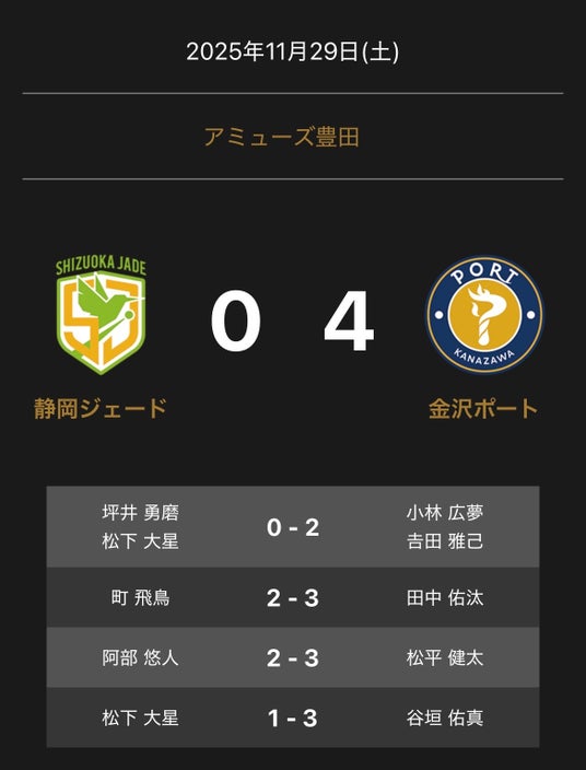 ノジマTリーグ 2025-2026シーズン 公式戦 11月29日開催 静岡ジェード vs 金沢ポート の試合は、0-4で金沢ポートが勝利しました。