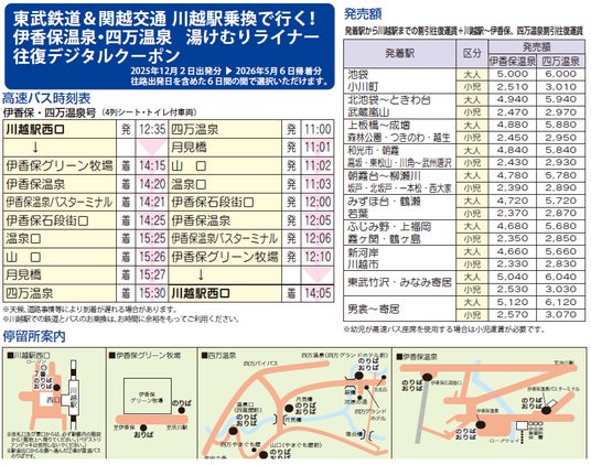東武鉄道株式会社と関越交通株式会社では、2025 年 12 月 2 日(火)出発分~2026 年 5 月 6 日(水)帰着分の期間限定で、東武東上線・越生線各駅から川越駅までの往復割引運賃と、関越交通の高速バス伊香保四万温泉号の往復割引運賃がセットになった「東武鉄道&関越交通川越駅乗換で行く!伊香保温泉・四万温泉 湯けむりライナー往復デジタルクーポン」を発売いたします。