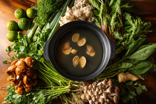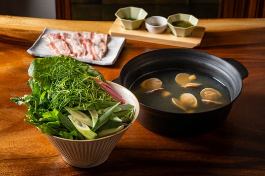 地鶏、カツオ、ハマグリをベースにした特製スープで旬の野菜を味わうヘルシー鍋です。九条葱、スイスチャード、春菊、ほうれん草、せり、おかひじきなど農家さん厳選の野菜と岩手県の銘柄豚「岩中豚(いわちゅうぶた)」をスープでサッとしゃぶしゃぶしてお召し上がりください。