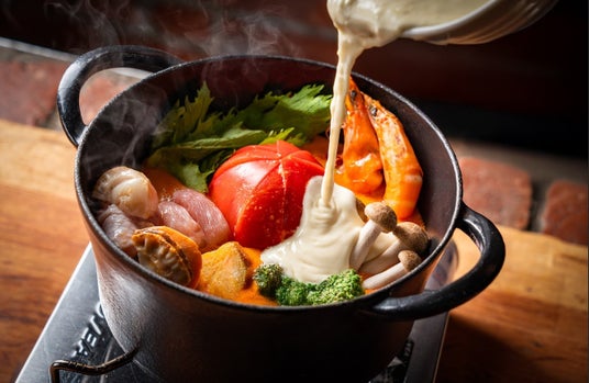 オマール海老のスープを加えたコクのあるベースに北海道産のホタテや海老、丸ごとトマトやインカのめざめなどゴロゴロ野菜を加えた【すべてが主役】の贅沢な鍋です。具材に火が通り、トマトがほどよく崩れてスープと混ざったらトロトロのチーズをかけて仕上げる冬にぴったりの味わいです。