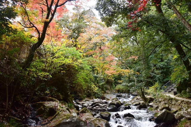 万葉公園「湯河原惣湯」川の道と紅葉と千歳川(イメージ)