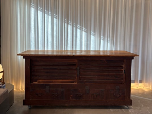 このカウンターは、100年以上の歴史を持つ家具で、丹後ちりめんの産地として知られる加悦町の旧町長邸で大切に使われてきました。地域で「宮津町家再生ネットワーク」を立ち上げ、シェアスペースの運営などを手がける建築家ご夫婦のご協力により、この貴重なカウンターはmizuyaへと受け継がれました。