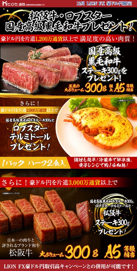ヒロセ通商株式会社 (本社:大阪府西区、代表取締役:野市 裕作、以下:当社)は、当社の提供する「LION FX」において、2025年12月1日(月)より、「LION FX豪ドル円限定 松阪牛・ロブスター・国産高級黒毛和牛プレゼントキャンペーン」を実施することをお知らせいたします。