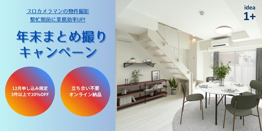 1月から始まる不動産業界の繁忙期を前に、物件撮影のスケジュール確保や人員負担が課題となっています。株式会社idea 1tasu(本社:東京都渋谷区、代表取締役:塚田一)は、撮影現場の省力化とコスト削減を実現するため、複数物件の「まとめ撮影」を推奨する限定キャンペーンを開始しました。