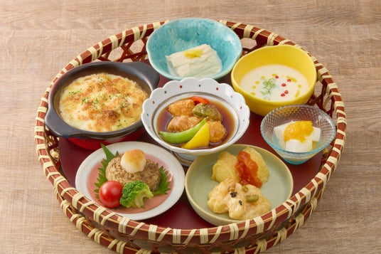 たぐり湯葉のお造り、カリカリ梅と大葉の和風ドリア、海老の豆乳マヨネーズ和えなど、和洋中のいいとこ取りをした欲張りな定食です 。