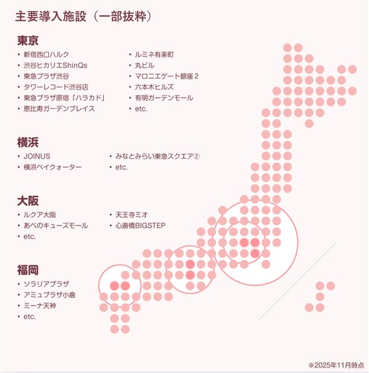 2024年8月末のサービス開始以降、2025年11月時点で首都圏・関西・九州エリアを含む主要都市へ100台以上展開しており、駅近の商業施設・テナントや店舗など、多様なパートナー企業とともに設置を拡大しています。