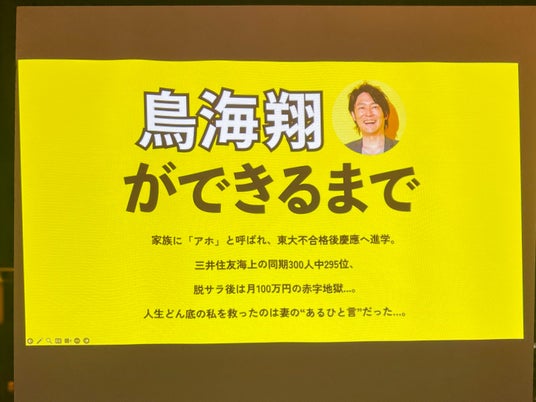 本イベントは書籍の発売を記念して開催され、会場には約40名が集まりました。前半の企画「鳥海翔ができるまで」では、鳥海が司会とスライドを用いて自身の歩みを振り返り、これまでの活動の背景や書籍が生まれるまでの経緯を紹介しました。