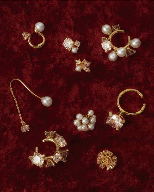 左上から時計回りに 開閉式イヤーカフ¥31,800、★両耳セットピアス¥44,000、キュービックジルコニア・淡水パールイヤーカフ¥47,300、キュービックジルコニア1石揺れイヤーカフ¥29,700、キュービックジルコニア11石ピアス¥31,800、淡水パール11石ピアス¥34,100、キュービックジルコニアイヤーカフ¥41,700、パールキャッチピアス¥22,000 ※★以外はすべてシングル すべて税込