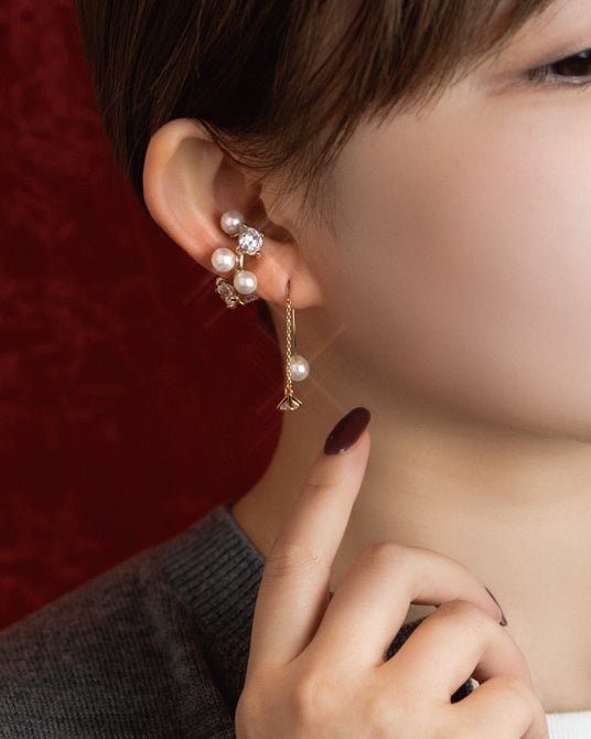 イヤーカフとピアス、イヤーカフの重ね着けなどコーディネート次第でドレッシーにもカジュアルにも見せられます。