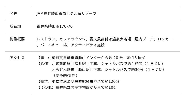 ※「JAM福井勝山東急ホテル&リゾーツ開業決定」のお知らせはこちら