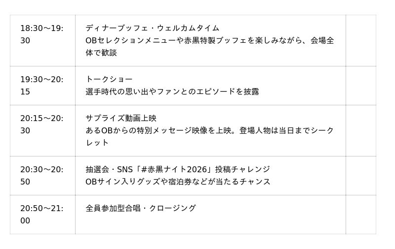 内容:北海道コンサドーレ札幌OB会CONSAOLDSメンバーによるトークショー、思い出メニュー提供、赤黒特製ディナーブッフェ、豪華抽選会、SNS投稿チャレンジ、映像・音楽・空間演出