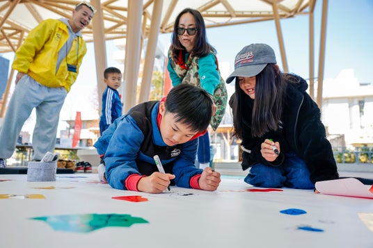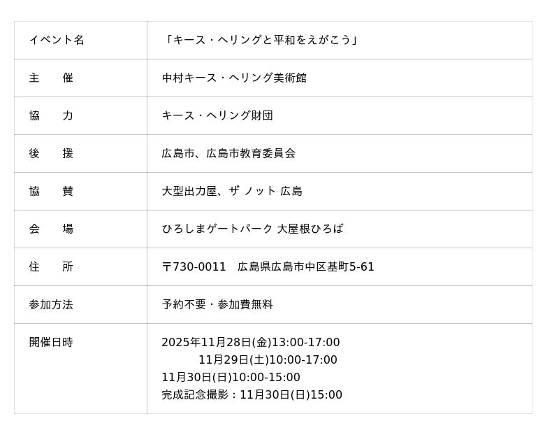 中村キース・ヘリング美術館(山梨県・小淵沢)は、2025年11月28日(金) ~ 30日(日) の3日間、ひろしまゲートパーク「大屋根ひろば」(広島県広島市中区)にて、特別イベント「キース・ヘリングと平和をえがこう」を開催しました。1988年に広島を訪れたキース・ヘリングが残した平和への願いを未来へつなぐことを目的に、「つがいの鳥」をバナーに描くワークショップを実施し、約250人の子どもたちによって大型バナーが描かれました。