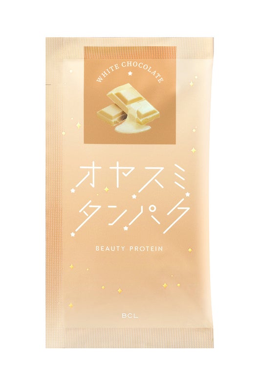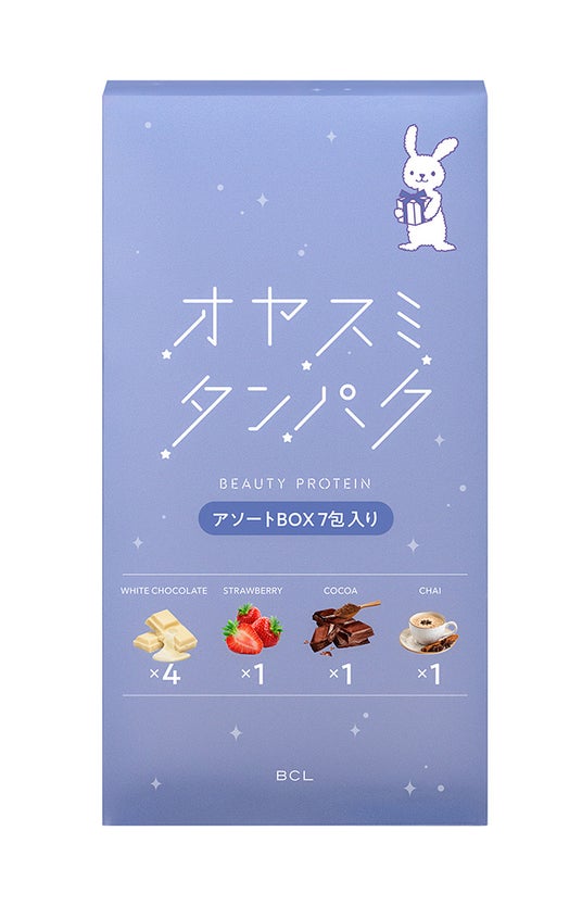オヤスミタンパク アソートBOX <プロテインパウダー> 7包入り(ホワイトチョコレート風味10.5g×4袋、イチゴ味10.5g、ココア味10g、チャイ味10g) ¥1,500(税抜) /¥1,620(税込)
