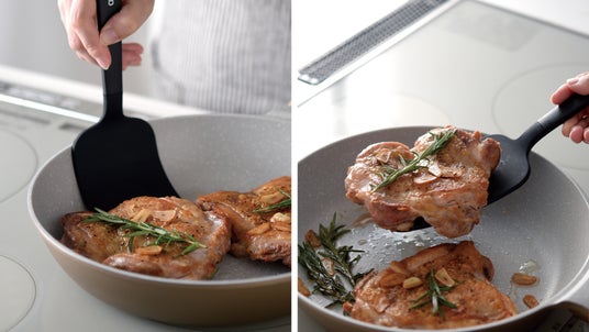 深型のフライパンや鍋でも側面からスッと差し込めるほか、先端は食材の下に差し込みやすいよう、薄さにこだわった形状に仕上げています。日常の調理で使いやすさを実感できるロングターナーです。