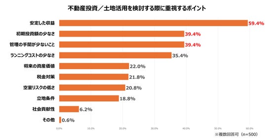 不動産投資/土地活用を検討する際に重視するポイントを尋ねたところ、最も多かったのは「安定した収益」(59.4%)でした。次いで、「初期投資額の少なさ」(39.4%)、「管理の手間が少ないこと」(39.4%)、「ランニングコストの少なさ」(35.4%)という結果になりました。この結果から、不動産投資や土地活用を検討する際の判断基準として、「安定収益性」と「管理効率」が重視される傾向にあるとわかります。