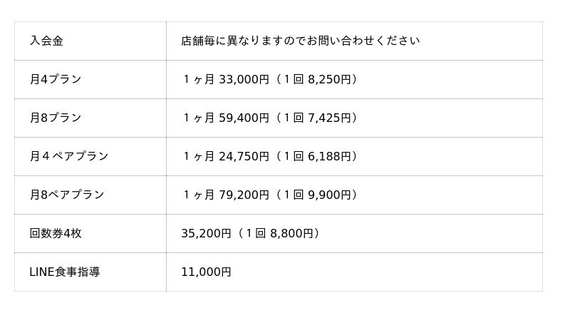 ・パーソナルトレーニング料金案内