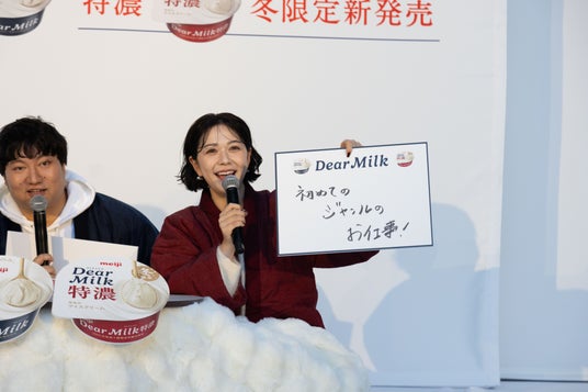イベントの終盤では、冬季限定で発売される新商品「明治 Dear Milk 特濃」も登場。乳脂肪分19.5%の濃厚な味わいを試食した3名は、「コクがすごい。仕事終わりに一息つきながらソファで食べるのにぴったり」「ミルクおじさん3人分のダンスくらい」とコメントし、新商品の魅力を伝えました。