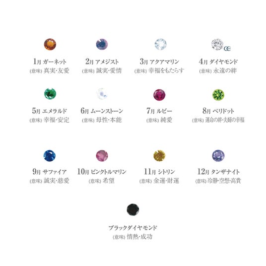 1月:ガーネット、2月:アメシスト、3月:アクアマリン、4月:O.E.カットダイヤモンド、5月:エメラルド、6月:ムーンストーン、7月:ルビー、8月:ペリドット、9月:サファイヤ、10月:ピンクトルマリン、11月:シトリン、12月:タンザナイト、その他:ブラックダイヤモンド、トリートブルーダイヤモンド