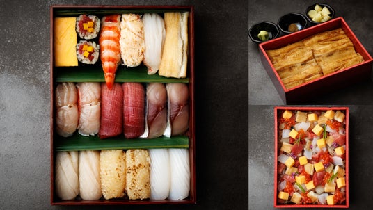 左:年末年始仕様極上握り/右上:穴子丼/左上:バラちらし