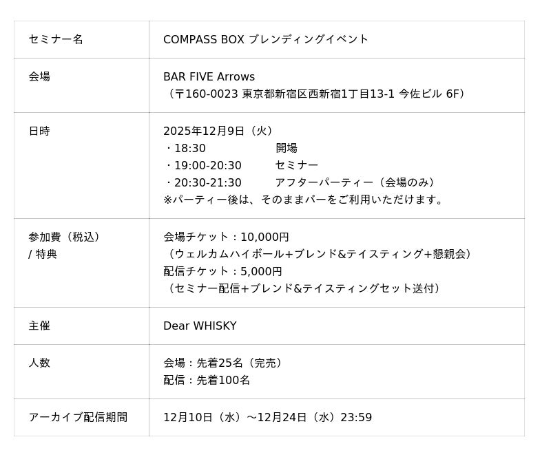 【ウイスキーイベント】2025年12月9日(火)「COMPASS BOX ブレンディングイベント」が開催決定!ご自宅からウイスキーのブレンドが楽しめる一夜限りの機会をお楽しみください!