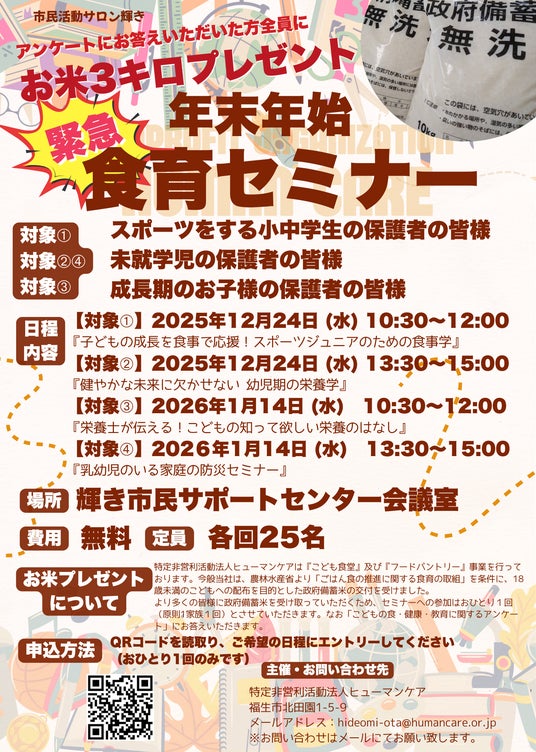 特定非営利活動法人ヒューマンケア(東京都福生市/理事長:半澤比呂美)は、農林水産省農産局より学校等・食事食材提供団体・フードバンクにおける政府備蓄米(無洗米10kg×60袋)の正式交付を受け、地域の子育て家庭を対象とした年末年始「緊急 食育セミナー」を2025年12月~2026年1月に無料開催いたします。