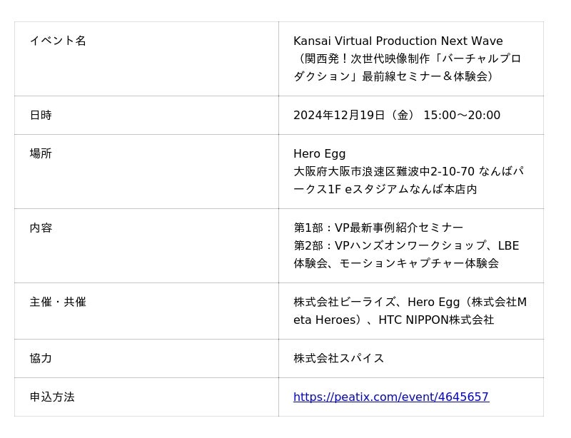 株式会社Meta Heroes(本社所在地:大阪府大阪市、代表取締役:松石和俊、以下「当社」)は、株式会社ビーライズ、HTC NIPPON株式会社との共催により、2024年12月19日(金)に、関西初となる次世代映像制作技術「バーチャルプロダクション(VP)」に特化した「Kansai Virtual Production Next Wave」セミナー&体験会を、当社運営のDX教育施設「Hero Egg」にて開催いたします。