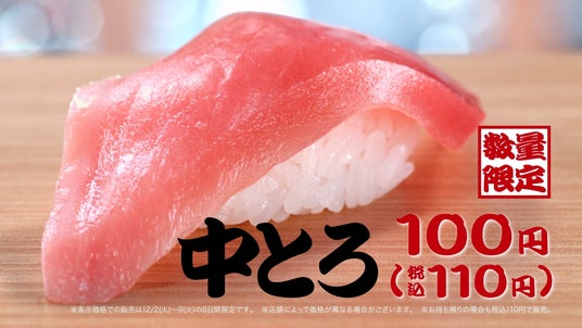 通常価格160円(税込176円)の「厳選まぐろ中とろ」を期間限定で100円(税込110円)で販売します。赤身と脂のバランスが良く、とろけるような味わいをお楽しみください。