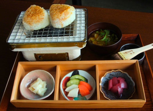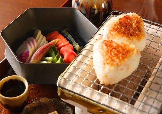 お漬物と焼きおにぎりのお膳仕上げには、河村屋の看板商品「大福神漬け」の特製タレを香ばしく塗り、