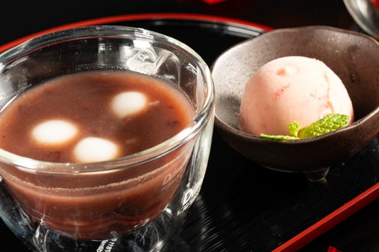 [ミルクチョコレートぜんざい&ストロベリージェラート] 北海道産小豆ぜんざいとクーベルチュールチョコレートを合わせた当ホテルアフタヌーンティー名物。ジェラートは甘酸っぱいいちごの果肉となめらかな口どけが特徴。