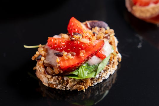 [いちごのカナッペ] ドライフルーツ入りのブレッドに、キヌアといちご、ストロベリーヨーグルトソースを合わせたヘルシーな一皿。