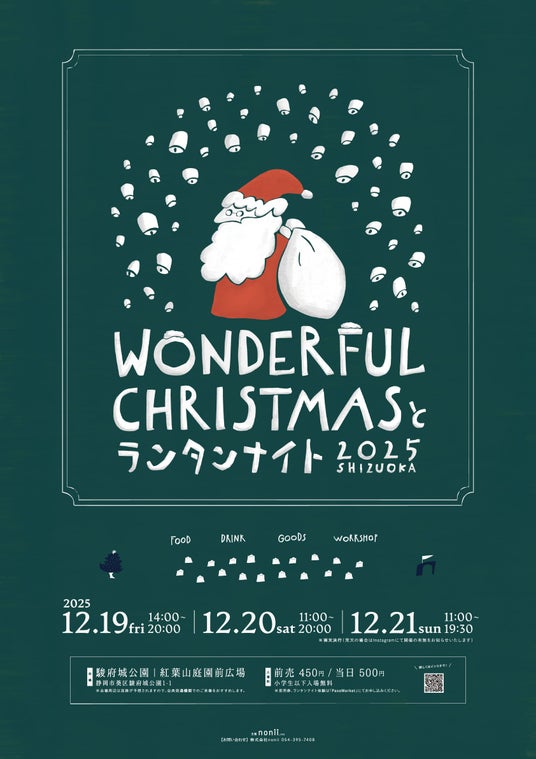 ◆「Wonderful Christmas と ランタンナイト 」駿府城公園で、絵本のページをめくるように光と温もりに包まれるクリスマスマーケットが初開催します。会場には、ローストチキンやシュトーレンといったクリスマスならではのグルメや焼き菓子、北欧をイメージした雑貨や体験コンテンツが並び、子どもから大人まで楽しめる空間が演出されます。夜には、幻想的な「クリスマスランタンナイト」を実施。夜空に舞うランタンが訪れる人々を優しく照らし、特別な冬の思い出をつくる場となります。