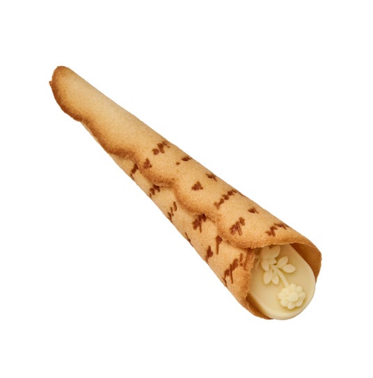 フランス産発酵バターを使用した香り高いラングドシャ生地に、素焼きアーモンドを入れ、ふんわりバニラ香るホワイトチョコクリームに花柄のチョコレートを飾りました。