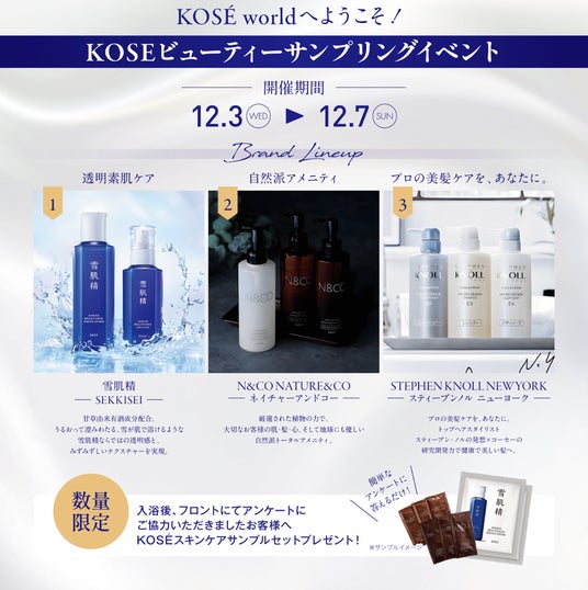 またアンケートにご協力いただいたお客様にコーセースキンケアサンプルセットをプレゼントいたします。(※各日先着順・数量限定)