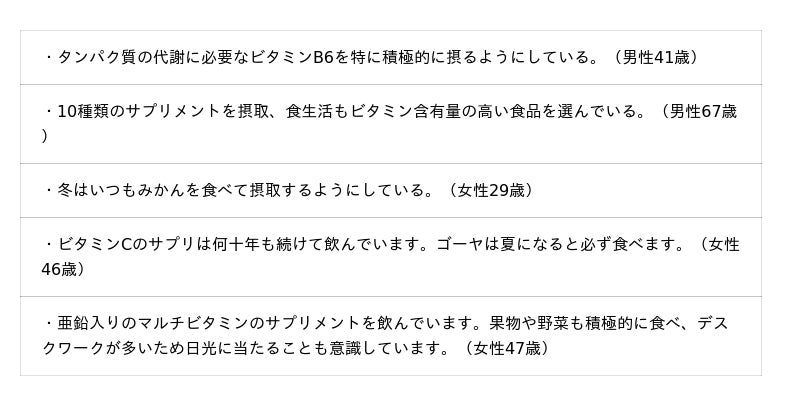 ビタミン類の摂取状況や効果実感などについて聞いています。調査結果をお知らせします。