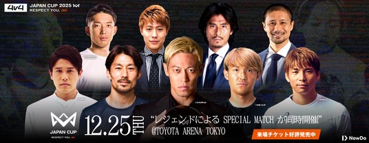 Now Do株式会社(本社:東京都新宿区、代表取締役:本田圭佑)は、12月25日(木)にTOYOTA ARENA TOKYO(東京都江東区)で開催する育成年代向け4人制サッカー全国大会「4v4 JAPAN CUP 2025 RESPECT YOU, au」(以下、本大会)において、決勝戦後にスペシャルマッチおよびレジェンドマッチの開催が決定いたしましたことをご報告いたします。