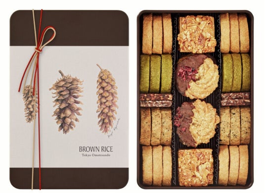 定番の人気フレーバーであるプレーン、抹茶、黒ごま塩に加え、フロランタン、チョコクランベリー、チョコパフ6種をセットにしました。スリーブには、BROWN RICE 店主の梶原建二による「松毬(まつかさ)」が描かれており、松は不変の生命力・長寿・繁栄・豊作の象徴とされ、年末年始の贈り物にもぴったりです。ちょっと贅沢をしたい日のおやつとしても、大切な人とのティータイムにもおすすめの、季節限定クッキーです。