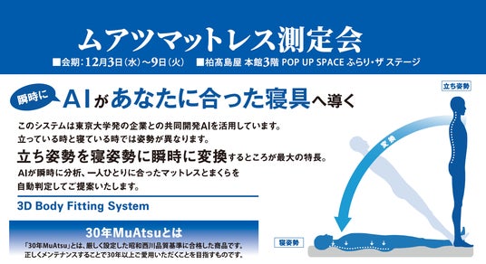 AIが瞬時に診断!【昭和西川】「ムアツマットレス測定会」を高島屋柏店本館3階にて開催<12月3日(水)~9日(火)>