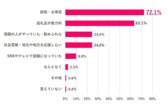 ふるさと納税をしたことがある人に、ふるさと納税を始めたきっかけを聞いたところ、1位「節税・お得感」72.1%、2位「返礼品が魅力的」63.1%、3位「周囲の人がやっていた・勧められた」24.6%、「社会貢献・地元や地方を応援したい」24.6%でした。