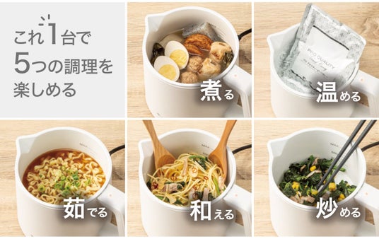 この度、「1台3役の電気ケトルポット」が「1台5役おてがる調理ポット」に進化して新登場! 毎日の調理の幅が広がり、より便利になりました。
