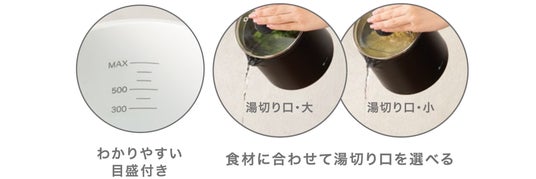 容器内側には300mL~800mLまで100mL単位で目盛りがついており、計量カップで水の量を計る必要がありません。ふたには大小の湯切り穴がついているので、パスタや野菜を茹でた後にざるを用意する必要もありません。洗い物を増やさずに調理できます。