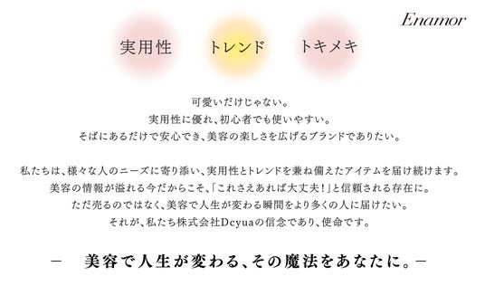 企業の成長を通じ、「美の力を社会へ還元し、誰もが自分を肯定できる活力ある環境づくりに貢献してまいります」ので、今後とも『Enamor』へのご愛顧を賜りますよう、何卒よろしくお願い申し上げます。