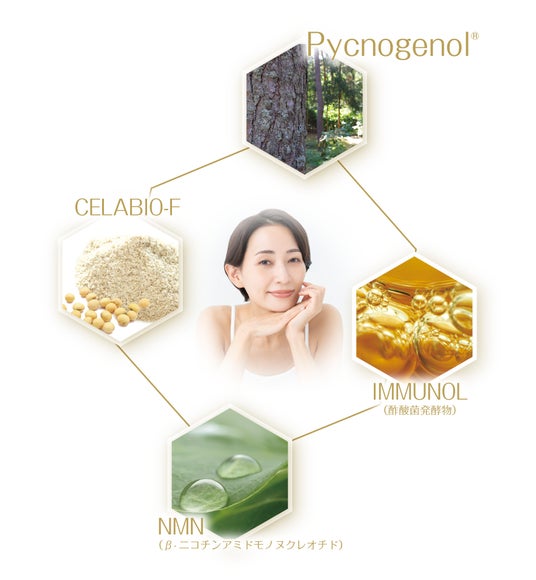 本品は、NMN・ピクノジェノール(R)をはじめとした9種類の自然由来素材をバランスよく組み合わせたオールインワンサプリメント。これまでの多角的なサポート設計に、新たにフランス海岸松由来のポリフェノール素材「ピクノジェノール(R)」を加えることで、美容・巡り・からだのリズムに加え、ゆらぎが気になる時期にも取り入れやすい内容へと広がりました。