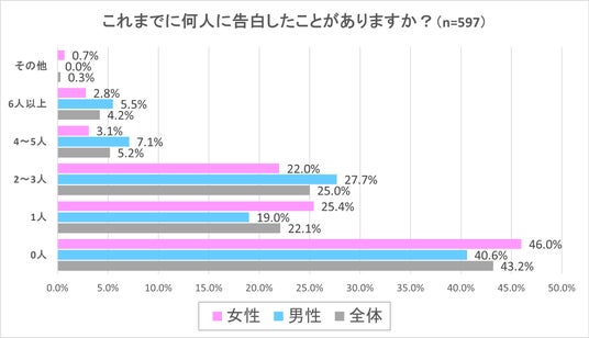 一方で、「交際経験なし」と回答したグループについては、男性82.9%、女性79.8%が告白した経験が「0人」という回答となり、交際経験のない男女約8割は異性に告白をした経験がないということが明らかとなる結果となりました。