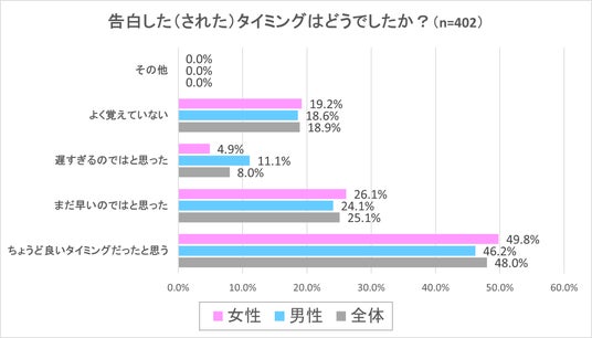 この設問では「告白をした(された)タイミングについてどのように思っているか?」について質問をしました。