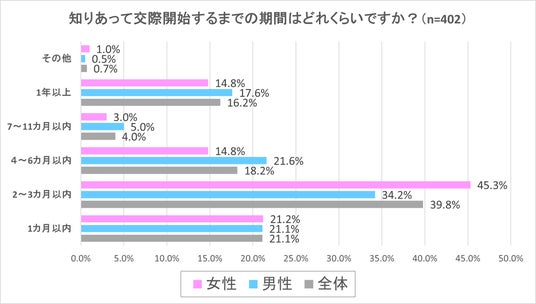 次に、前の設問で「これまでに交際経験がある」と回答した男女402名に、「知りあって交際開始するまでの期間はどれくらいでしたか?」と質問をしました。