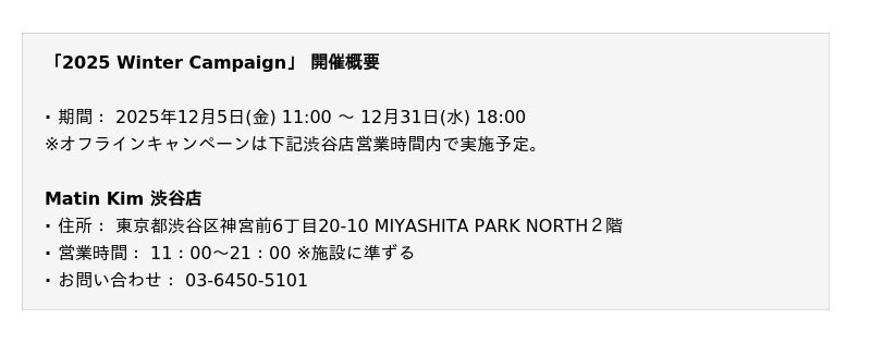 MUSINSA(ムシンサ)が日本国内の流通を担当する、韓国発のファッションブランド「Matin Kim(マーティンキム)」は、ホリデーシーズンに合わせた「2025 Winter Campaign」を、2025年12月5日(金)から12月31日(水)まで、Matin Kim 渋谷店にて開催いたします。