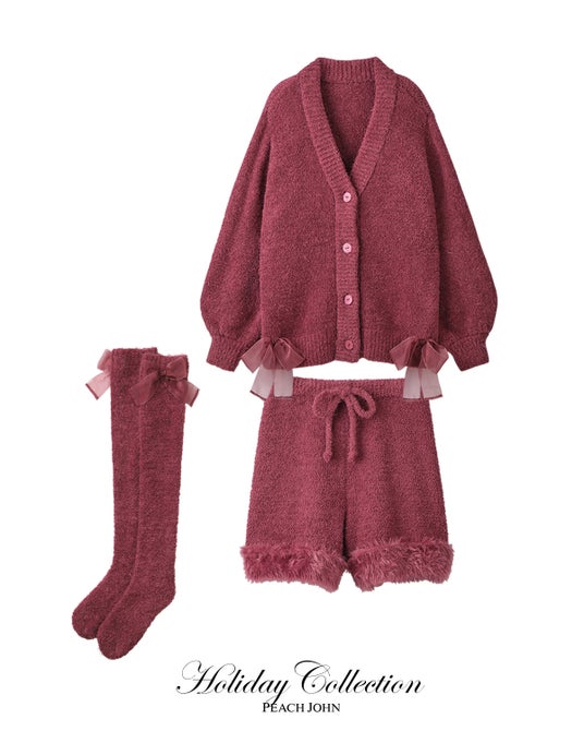 毛足が長く、ふわふわと地厚であたたかなフェザーヤーンニットを使用した冬のPEACH JOHNの定番あったか素材のルームウェア。カーディガン、ショートパンツ、ハイソックスを合わせれば、華奢見え、脚長効果抜群です。オーガンジーのリボンも大人かわいいを演出し、ホリデーシーズンに大活躍間違いなし。