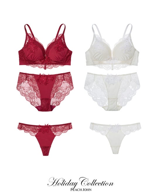 ホリデーの定番カラー “レッド”ランジェリーをはじめ、ふわふわ素材やキラリと煌めくラメを使用した、とっておきのラインナップです。その他、店舗限定で人気ノンワイヤーブラの新デザインを発売するほか、お世話になった方へのプレゼントとしてもぴったりのギフトセットも展開中です。