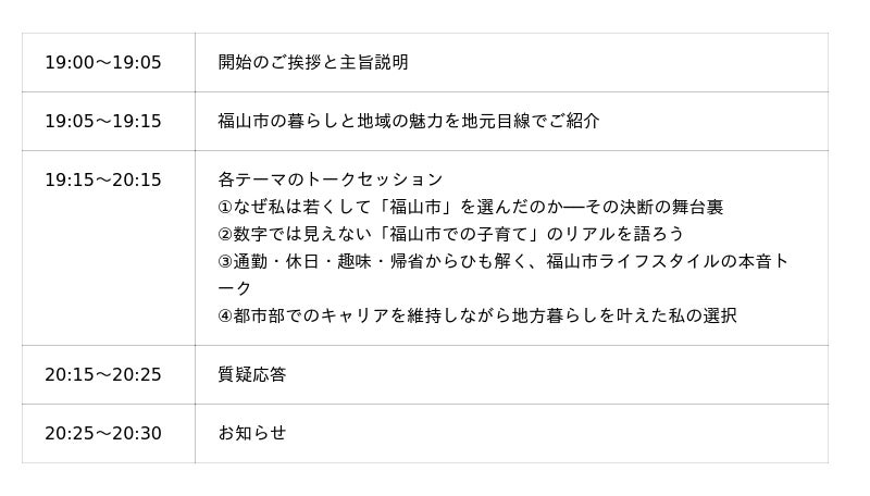 「地域の仕事"ホンネ"サロン 福山市編~なぜ福山市なのか?生活の充実とキャリア、どちらも諦めない選択ができる理由~(仮)」をテーマに12月末に開催予定です。三重県編に続き、都市と地方の“いいとこ取り”ができるまちとして注目される福山市の魅力を余すことなくお伝えし、関係人口創出の取り組みをさらに広げていきます。